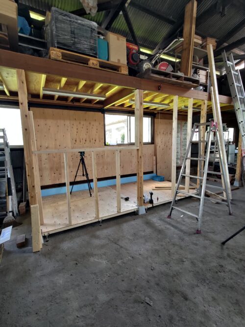 木部にケイカルを張り付け、その上に軽天用Cチャンの固定を行いその上にWバーをねじ止め。