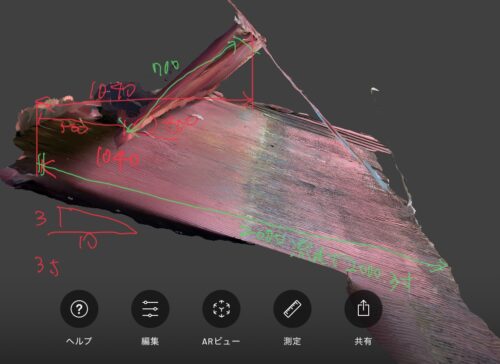 大工さんが波板の一部を取り外して内部構造を確認している間、私はタブレットで現地のスキャンを行って3D図を作り欲しい画角でスクショ→寸法の記入。