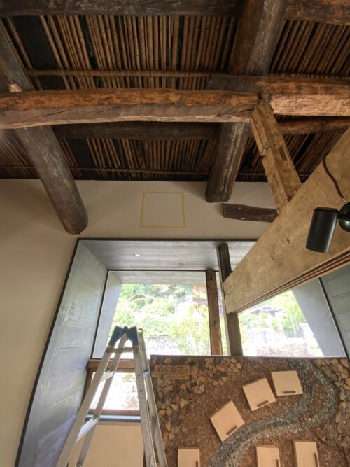 今回は茅葺屋根を貫く屋根出しでは無く、ロビーの中央へストーブを設置して換気扇で排煙する方式を採用しました。