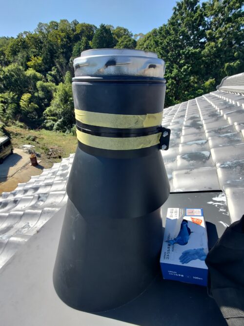 前日にお部屋の中まで煙突を固定している間に、屋根の上ではフラッシングの防水工事を行って貰っていたので翌日にストームカラーの取り付けを実施。