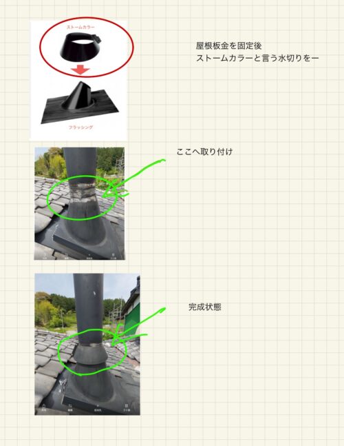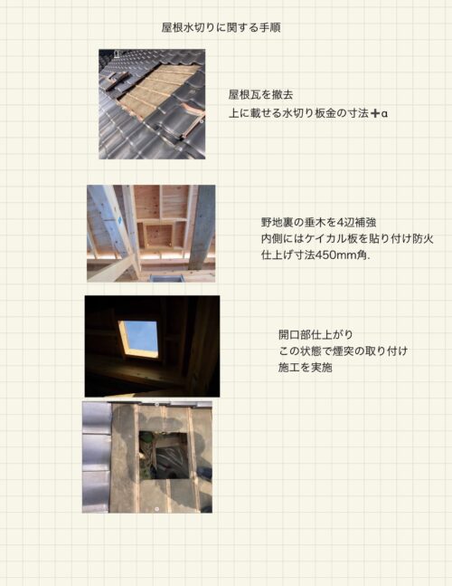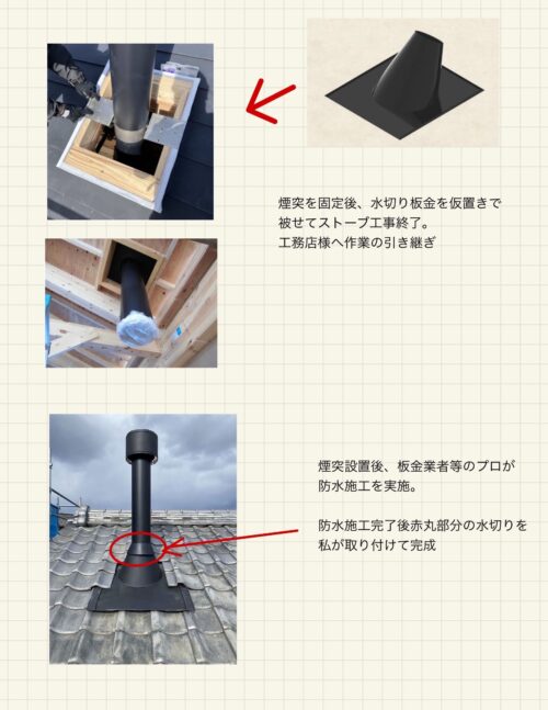 屋根を開口した後に私が煙突設置工事を行い、フラッシングを現場に仮置きするので板金屋さんが防水施工
