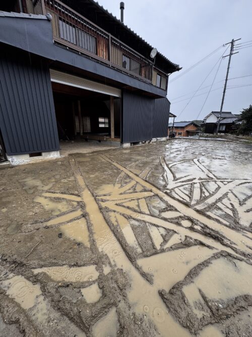 前日は気持ちの良い秋晴れで何も違和感なく通り過ぎた地面が、翌日はまとまった雨のお陰でぬかるみが深くなり、大工さんの2駆軽トラがスタックしてしまう路面状態。