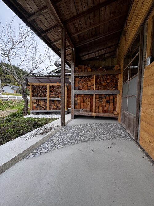 設置場所の引き戸を開ければ外には犬走が整備され、薪だなに薪を貯蔵できる理想的な動線を確保。