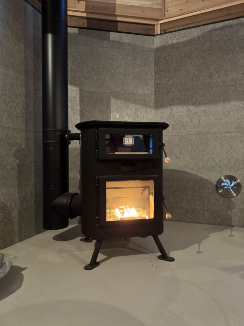 そしてこの現場はモルタルを打設した土間に直置きなので、ストーブ底面の遮熱板を取り外し意図的にコンクリートに蓄熱を促す仕様を採用。