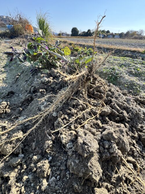 冬野菜への植え替えの時ナスの根を確認すると、今まで見たことが無いくらい太くて緻密に根が育っていました。