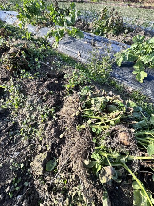すると、元々田んぼだった畑は雨が降る度に土がコンクリートの様に硬くなってゆくので大根やニンジン、お芋さんはスジが沢山発生するし、ストレスが大きいのか葉っぱにトゲが生まれたりしたのです。