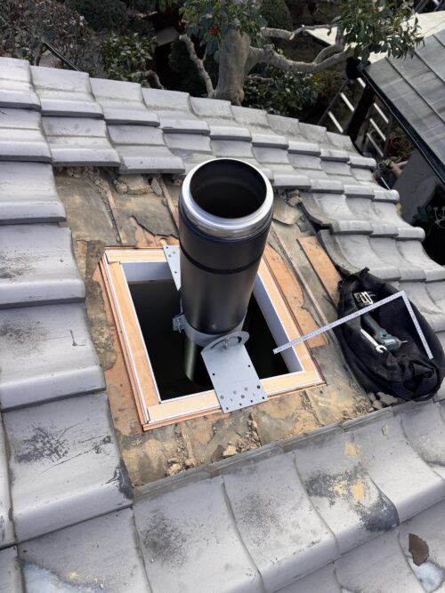 フラッシング設置の方が工事は簡便だけど煙突を取り付けたあと、防水処理が完了するまで屋根防水がない状態が発生するのでお数日間お天気が続かないと作業する事が困難だし工期も長くなるので設置する現場の状況を見ながら最適な選択を行いたい。