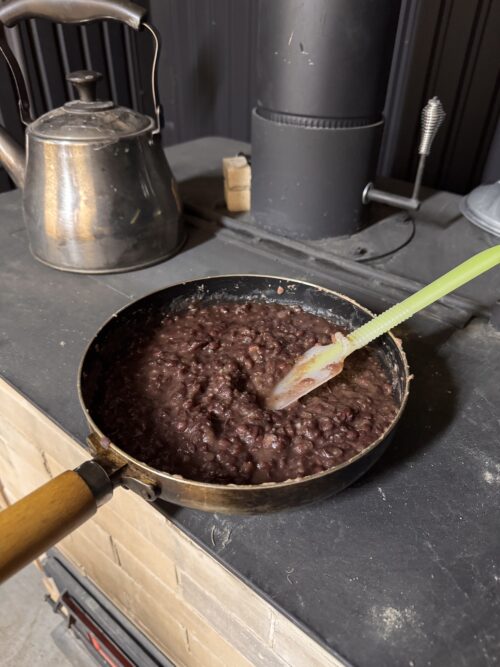 アンコ作りって焦がさない様にしながら長時間煮込む必要があるので、全て自分で作るのは面倒なのですが豆を茹でる工程を炊飯器で行い、最後の煮込んで水分を蒸発させる工程を薪ストーブで行うとすごく簡単に作る事ができるので自作のハードルがとても低くなる。