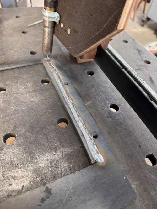 この写真は実験段階で溶接速度の条件出しを行っていた時に撮影した写真だからすごくきれいな外観と言う訳では無いけど、初めて自動送りを使った溶接直後だったので結構感動しました。