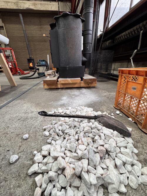 結果、石から水蒸気が立ち込め、その後完全に乾燥した。石が割れる気配は一切なかった。今回は数回の焚き上げを通じて確認したが、いつも通りの輻射熱をストーブ周囲に感じることができた。石灰岩使用時と体感上の差異はなく、蓄熱性能は維持されていると判断している。