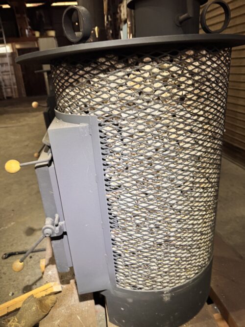 最初の作業は、展示ストーブの金網に入っていた石灰岩の撤去だ。これは何度も経験しているので手順が固まっている。ストーブを横倒しにして、先端を曲げた棒で石を掻き出す。これが最も早く確実な方法だ。