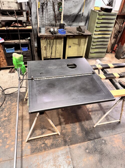 通常のサウナストーブだと天板を開放する事も無いので、裏側に強力なリブを設置するなどの対策を施す余地が有るのだけど開閉式にすると重量増加とスペースの関係からヒズミ発生対策に使用できる回避策に制限が発生します。