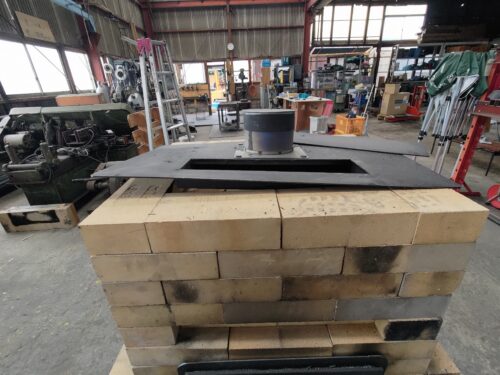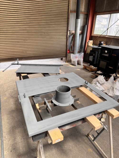 現場で煙突接続作業が出来る様に設計しているし、天板が歪まないよう裏側の補強、炎の通路など総合的に勘案して作っている。