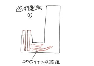 私が使っているロケットストーブは巡航運転に入るとほぼバーントンネル(スケッチの炎を描いている部分)で2次燃焼が完結しています。
